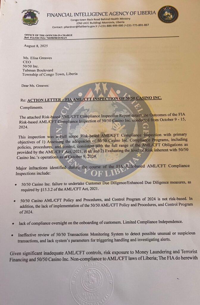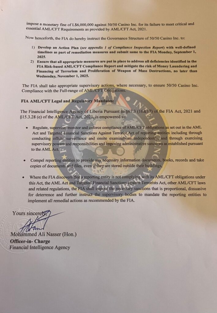 FIA fines 50/50 CASINO INC. for Significant Lack of AML/CFT Controls See Letter Below: Post published:12 August 2025