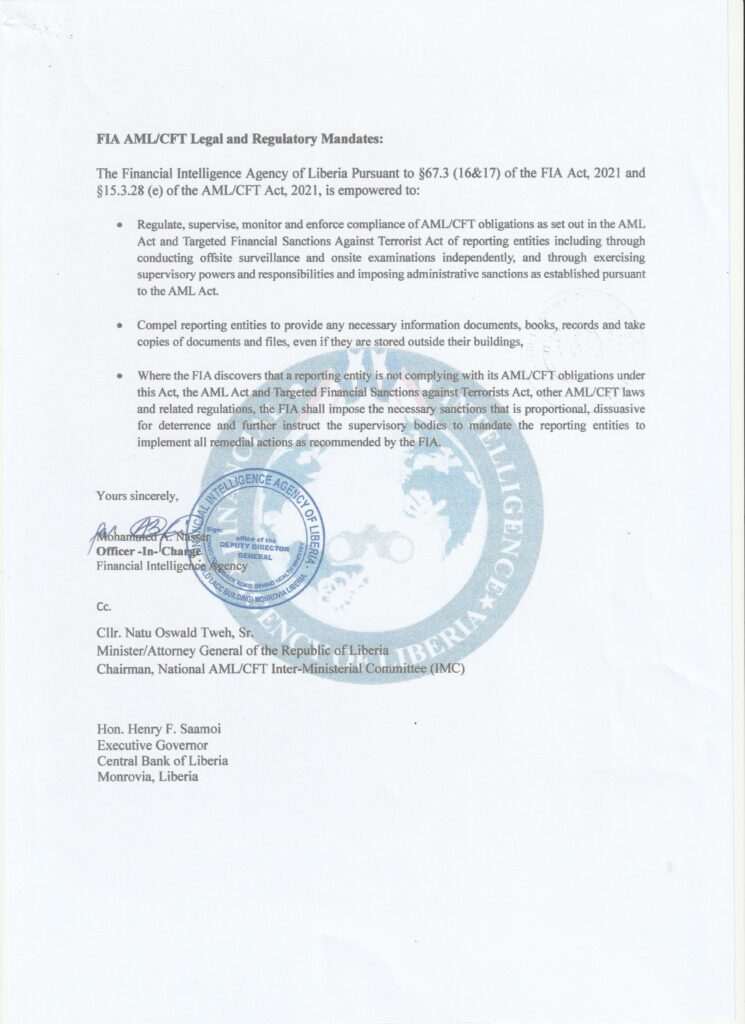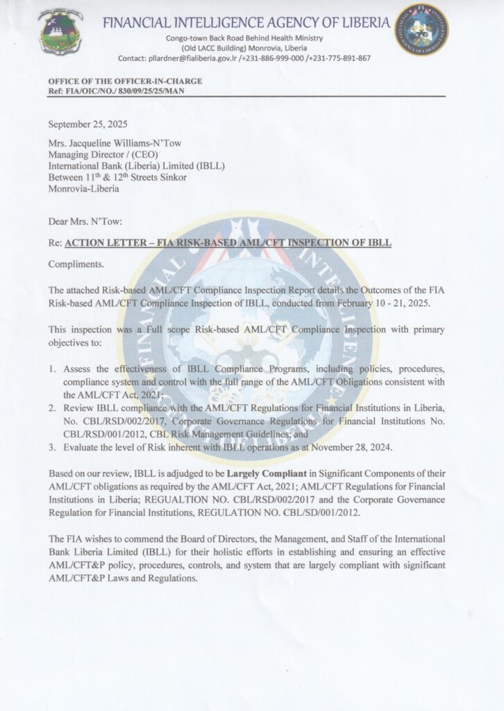 FIA Recognizes International Bank of Liberia for Significant Compliance with AML/CFT Regulations and admonishes it to address gaps. See Letter Below: Post published:26 September 2025